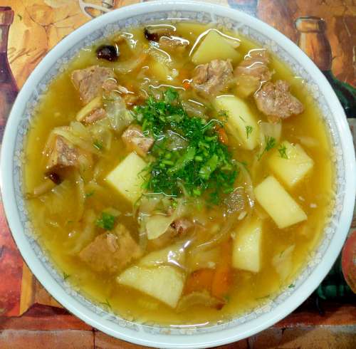 Краткое описание: В овощной бульон последовательно добавляются жареные грибы, жареный лук, овощная зажарка (морковь, стебель сельдерея), квашеная капуста, картофель, свежая капуста. Щи довариваются до готовности картофеля, заправляются горчицей и рубленным чесноком.