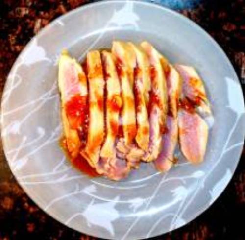 Краткое описание: Стейк тунца маринуется в смеси оливкового масла, соевого соуса, лимонного сока, чеснока, специй и трав 20-30 минут,затем обжаривается на двустороннем электрогриле 1.5-2 минуты, выдерживается 2-3 минуты перед подачей и подается нарезанный слайсами поперёк волокон с соусом терияки.