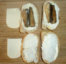 | Шпроты, сыр Сулугуни. | Шпроты запекаются с сыром и зеленым луком между двух ломтиков намазанного маслом хлеба. |