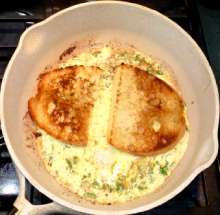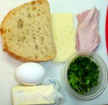 | Комбинация омлета и тоста | Ломти хлеба поджариваются с двух сторон на сливочном масле до легкой корочки, выкладываются на схватившийся омлет. По готовности омлет вместе с ломтями хлеба переворачивается, на один из ломтей выкладываются ломтики ветчины и сыра, ломти складываются так, чтобы они оказались точно один над другим. В середине окажется начинка с омлетом. |