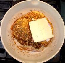 Поджарить хлеб до золотистой корочки, перевернуть, обжарить с другой стороны, убрать со сковороды.
