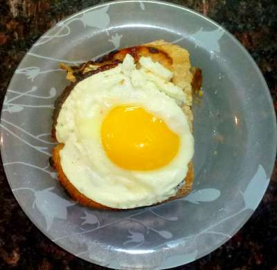 Яичница-глазунья. Тост с ветчиной и сыром поджаривается на сковороде вместе с яйцом, подаётся накрытый яйцом - глазуньей как шляпкой.