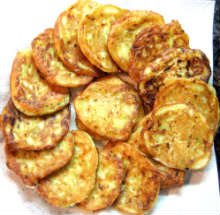 | Кабачки | Кабачки натираются на крупной тёрке, смешиваются с готовой смесью для оладьев, добавляется вода до образования жидкого теста и оладьи жарятся на растительном масле. |