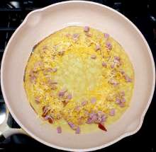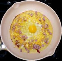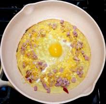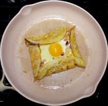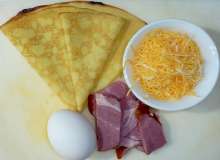Блинчики На разогретую сковороду выкладывается блинчик, на него последовательно кладутся мелко нарезанная ветчина, тёртый сыр и сырое яйцо. Когда яйцо начнёт схватываться, края блина заворачиваются конвертом и блюдо доводится до готовности.