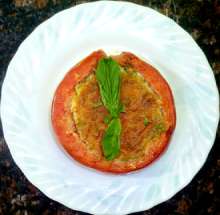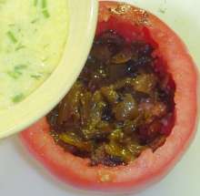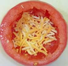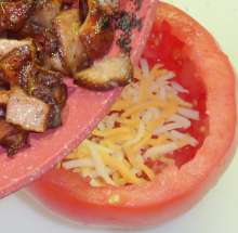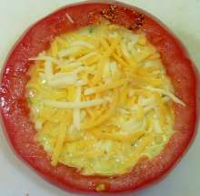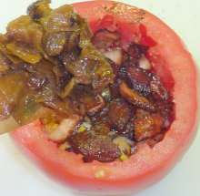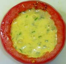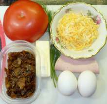 | Крупный помидор | В крупный помидор с вынутой мякотью последовательно выкладываются слоями тёртый сыр, поджаренная колбаса, жареный лук. Ингредиенты заливаются омлетной смесью. Омлет посыпается сыром и запекается 15 минут при 180 С. |