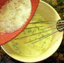 Если жареного лука нет - поджарить (см. как)Приготовить омлетную смесь: смешать яйца, молоко, укроп, соль, перемешать.