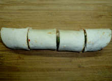 Аджика, йогуртовый соус. На тонкий лаваш укладывается слой ветчины, смазывается аджикой. На половину лаваша сверху укладываются ломтики сулугуни, на вторую половину - зелень. Лаваш плотно сворачивается в рулет, разрезается на небольшие куски. Фрагменты рулета ставятся вертикально, сверху выкладывается соус (йогурт + чеснок + варёный желток).