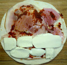 На лаваш выложить слоем ветчину.