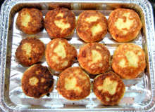 Мокрыми руками сформировать шарики величиной чуть больше грецкого ореха, обвалять в муке, расплющить в лепешку толщиной 1 см.