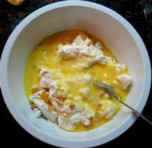 Смешать творог и яйца, добавить изюм. Можно добавить любые сушеные ягоды и цукаты. Добавить разбухшую манную крупу, сахар, ванилин. Всё тщательно перемешать.