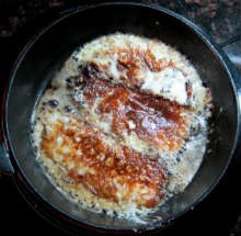 Мука Рассольный сыр режется толстыми ломтями, обваливается в муке и обжаривается в масле.