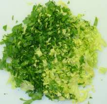 Соединить зелень, овощи, специи с фаршем, добавить соль, растительное масло.