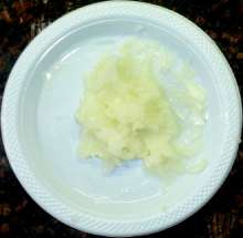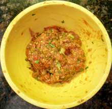 Фарш должен получиться пластичным, чтобы его легко можно было размазать тонким слоем. Если фарш черезчур сухой - добавить нужное количество сока от натёртого лука или воду.