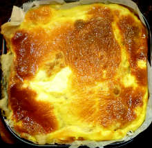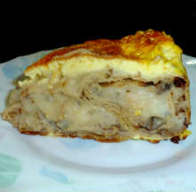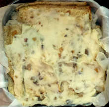 | Лаваш | Грибы обжариваются с жареным луком и добавляются в картофельное пюре вместе с обжаренным беконом. Начинка заворачивается трубочками в несколько прямоугольников из лаваша. Трубочки лаваша с начинкой укладываются в форму для запекания и заливаются яично-сметанной смесью с тертым сыром. Пирог выпекается при 180 С 35 минут. |