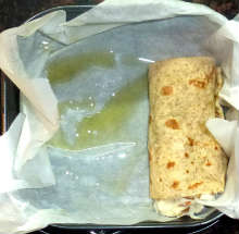 Свернуть лаваш с начинкой в трубочку, выложить в форму.