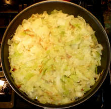 Капусту нарезать соломкой, выложить на нагретую сковороду с растительным маслом. Поджарить на сильном огне до легкой корочки.