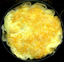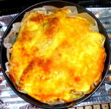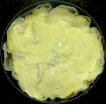 | Лаваш | Готовится куриный фарш с добавлением жареного лука и тертого сыра, заворачивается в тонкий лаваш в виде валика. Валики из лаваша укладываются в смазанную маслом и посыпанную сухарями форму для запекания и заливаются соусом (взбитые яйца + сметана). Сверху пирог посыпается тертым сыром и запекается при 180 С 30 минут. |