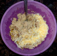 Куриное мясо смолоть в мясорубке или блендере. Добавить жареный лук, тщательно перемешать. Добавить половину тертого тыра, перемешать.