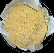 Подготовить форму для запекания (у меня - разборная металлическая форма). Застелить дно формы пергаментной бумагой, слегка смазать её оливковым маслом, присыпать сухарями.