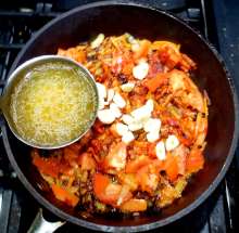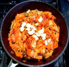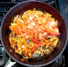Добавить в сковороду. Жарить до появления помидорного сока.