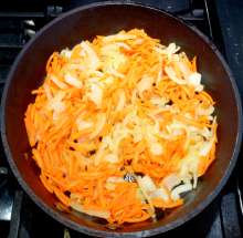 Морковку натереть на крупной тёрке или нарезать соломкой.