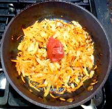 В центр сковороды выложить томатную пасту. Жарить несколько минут, затем перемешать.