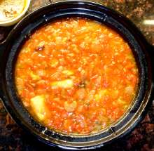 Сухие и свежие грибы, помидоры. Картофель, рыбное филе, поджаренные овощи, сухие и свежие грибы помещаются в горшок медленноварки (или порционные горшочки), заливаются рыбным бульоном и томятся до готовности картофеля. Незадолго до окончания варки добавляются свежие помидоры. Готовый суп заправляется чесноком и зеленью.