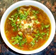 Готовый суп заправить рубленным чесноком.