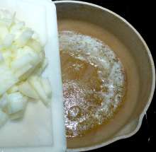 Выложить лук в сковороду.