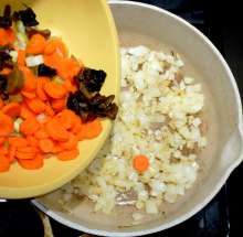 Когда лук зажарится до прозрачности - добавить сельдерей, морковь и грибы.