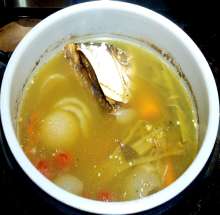 В данном случае янтарный цвет бульона обусловлен использованием лука с кожурой и моркови.