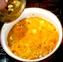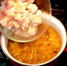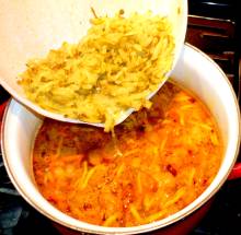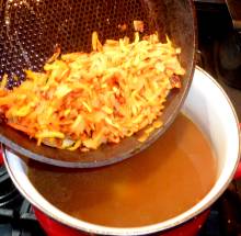 Выложить картофель в кипящий бульон. Варить 7 минут.