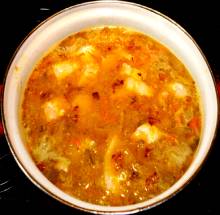 | Гречневая крупа, солёные огурцы, сливочное масло, сахар. | В кипящий процеженный рыбный бульон последовательно добавляется картофель, овощная зажарка (лук, морковь, корень петрушки), припущенные со сливочным маслом солёные огурцы, подготовленная красная рыба. Суп заправляется огуречным рассолом, доводится до кипения и снимается с огня. При подаче в тарелки выкладывается сваренная гречка и заливается горячим супом. |