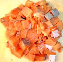 Нарезать рыбу небольшими кубиками.