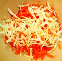Морковь и корень петрушки натереть на крупной тёрке.