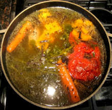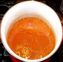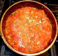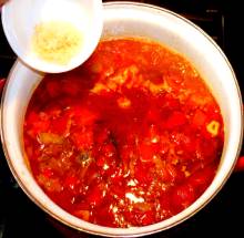 Добавить специи (у меня – уцхо сунели, сухой чеснок, черный перец). Довести смесь до кипения.