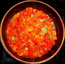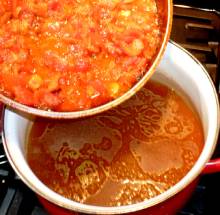 В оригинальном рецепте чеснок загружается в сковороду вместе с остальными овощами, но я не считаю это правильным, потому что чеснок жарится минуты и если пригорит – весь суп будет горчить. Если у вас свежие помидоры – их нужно обдать кипятком, выложить в ледяную воду, затем снять шкурку и нарезать мелким кубиком.
