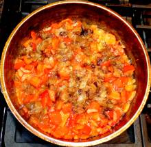 В оригинальном рецепте лук жарится вместе с перцем, однако у них разное время готовности, поэтому я предпочитаю жарить их отдельно.