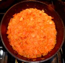 Выложить натертые помидоры к овощам.