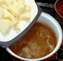 Выложить картофель в кипящий бульон.