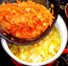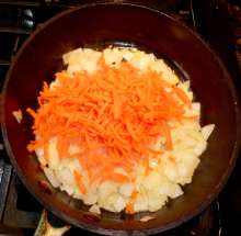 Когда лук станет прозрачным – добавить морковь.