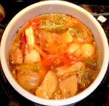 В оригинальном рецепте мясо отваривается только с лавровым листом, но я всегда варю бульоны с овощами – так достигается более богатый вкус супа.