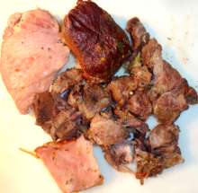Подготовить копчености (у меня – ветчина и обрезки).