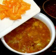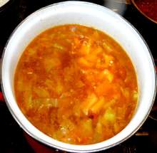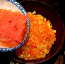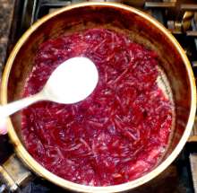 В оригинальном рецепте свекла тушится вместе с остальными овощами, но она имеет гораздо большее время приготовления, чем лук и морковь, поэтому я всегда тушу свеклу отдельно.