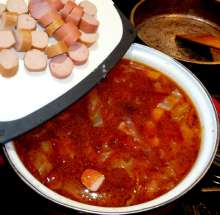 Классический русский борщ, но с региональными особенностями. Вкус этого борща интенсифицируется за счет добавления необычных мясных ингредиентов - копченостей и сосисок.