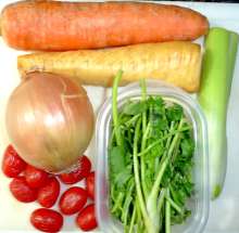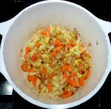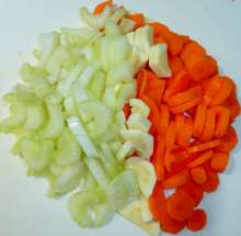 Нарезать произвольно морковь, стебель сельдерея, корень петрушки.