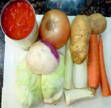 Бульон на свиных рёбрышках, помидоры в собственном соку, репа Лук, морковь, стебель сельдерея, корень петрушки последовательно выкладываются в кастрюлю и пассеруются до мягкости, затем добавляется крупно нарезанная капуста, а через несколько минут – картофель. Ингредиенты заливаются горячим мясным бульоном, добавляются рубленные помидоры в собственном соку, репа и щи довариваются до готовности картофеля.