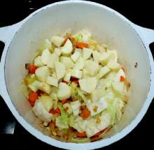 Добавить капусту к овощам, прогреть несколько минут, чтобы она размягчилась.