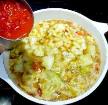 Если у вас свежие помидоры – их нужно освободить от шкурки и потушить вместе с кореньями, но у меня томаты уже тушеные, так что я их добавляю на этом этапе.