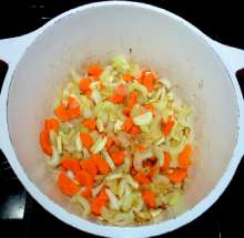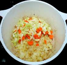 Нарезать произвольно морковь, стебель сельдерея, корень петрушки.